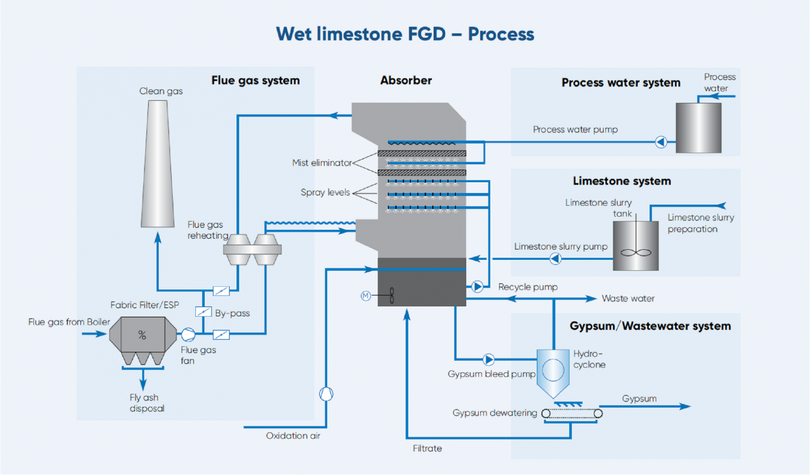 Baca gazı kükürt giderme (FGD) işlemi, gazların temizlemek için tipik olarak ALKALİ bazlı bir kireç çamur bulamacı sprayler vasıtası ile baca gazının üzerine püskültülerek kükürt dioksit (SO2) emilmekte ve ıslak bir kalsiyum sülfit (CaSo3) haline gemektedir. Daha sonra Kalsiyum Sülfit (CaSo3) , oksijen üflenerek Kalsiyum Sülfata (CaSo4) dönüştürülebilmekte ve Kalsiyum Sülfat ise (CaSo4) diğer adı ALÇI olan karışım kolaylıkla satılabilmektedir.